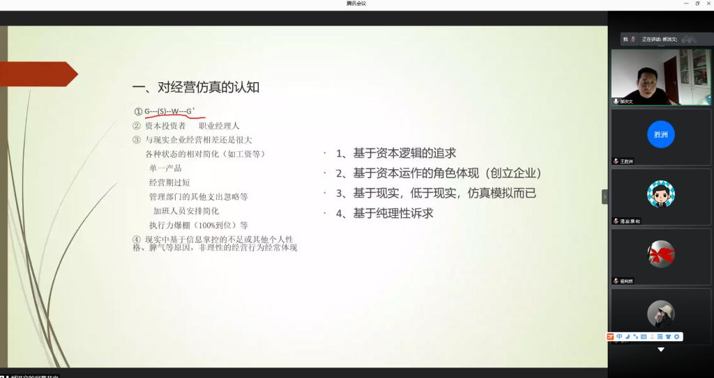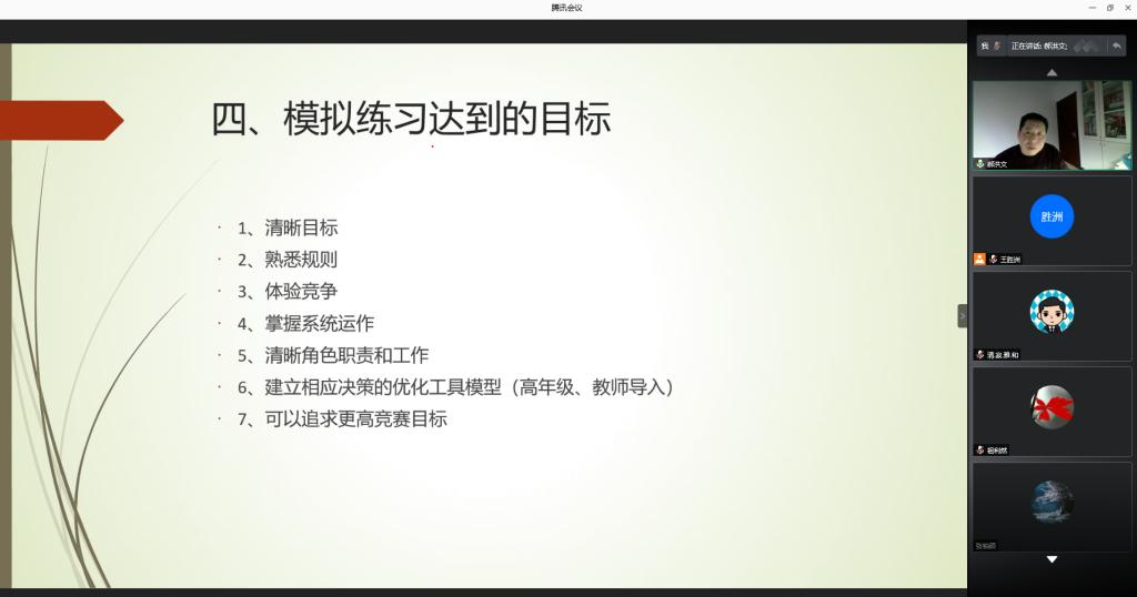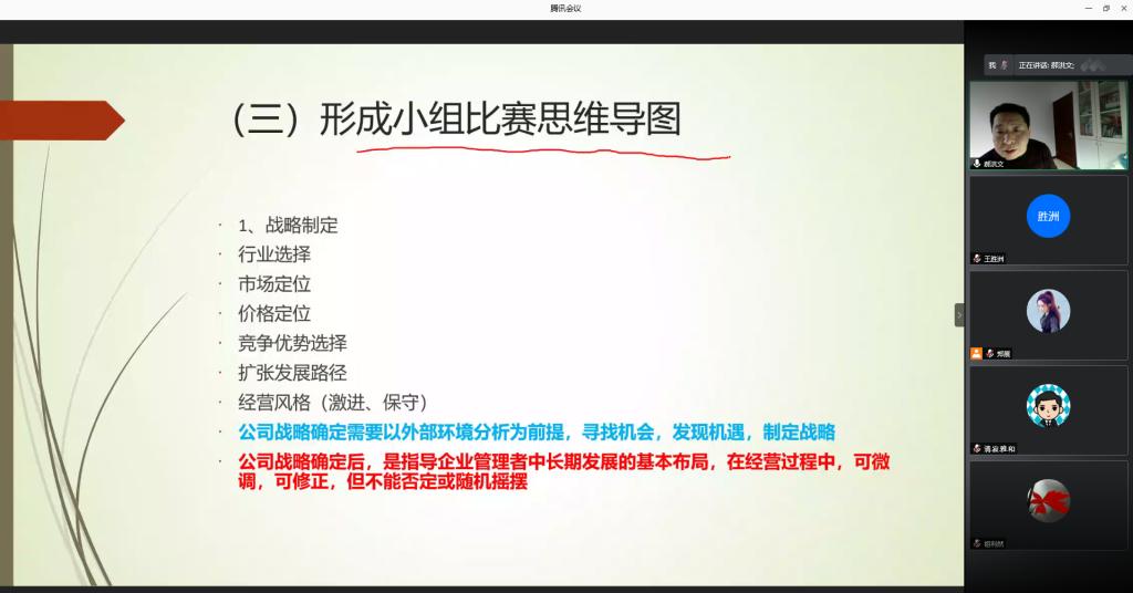 为提升参赛师生对赛事的认知水平,加强师生对规则的深度理解,助力师生构建系统战略思想,做到以赛促学,公司于1月24日下午,通过腾讯会议,举办企业运营仿真竞赛线上培训。培训由副经理王胜洲主持,企管系资深教师郝洪文主讲,公司党委副书记梁泽锋、各系正、副主任以及各参赛团队指导教师和150余名参赛员工参加培训。