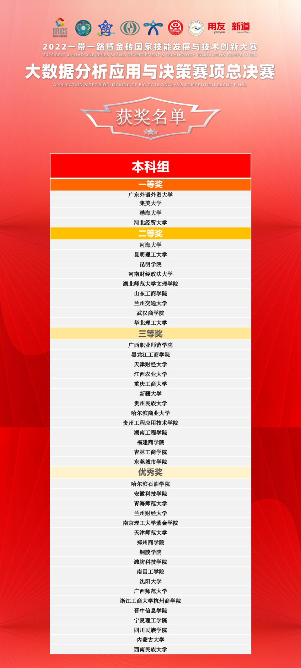 2022年10月23日,2022一带一路暨金砖国家技能发展与技术创新大赛(大数据分析应用与决策赛项)总决赛在线上圆满结束。sunbet参赛团队在比赛中脱颖而出,荣获全国总决赛一等奖。