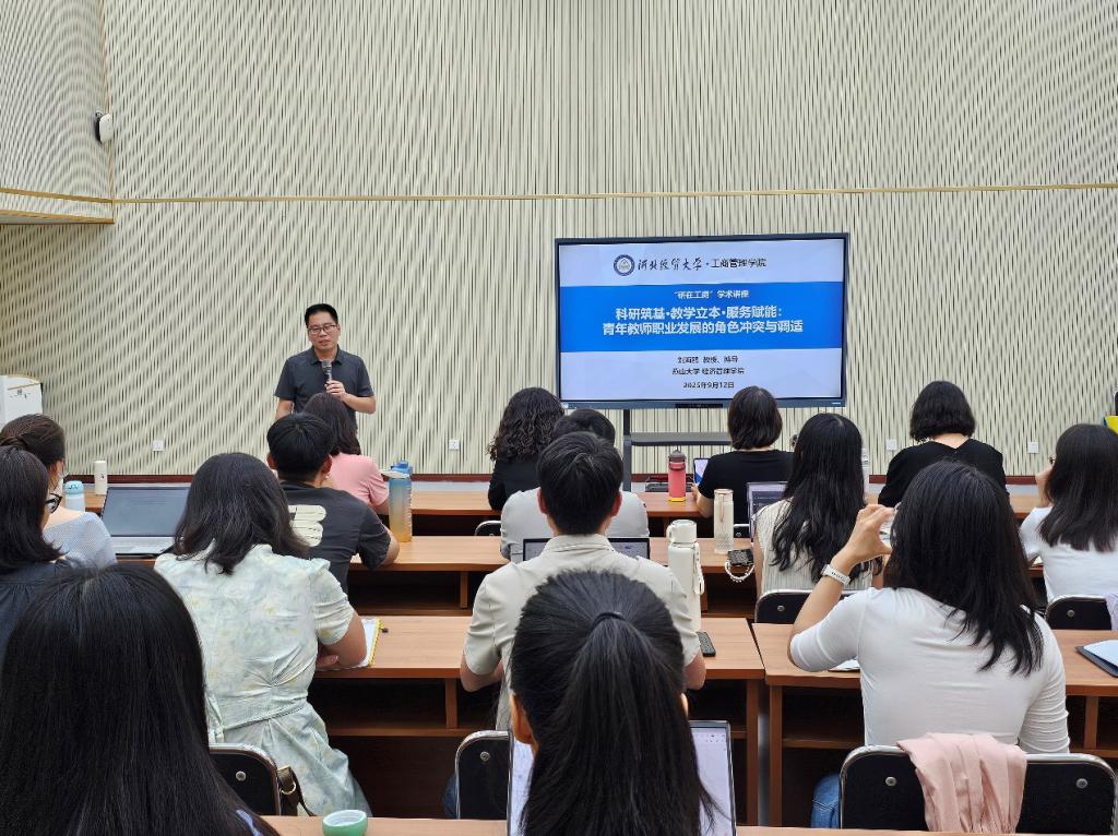 9月12日,周末专家河北行·青椒成长营系列活动之“研在工商”学术讲座于MBA一教室举行,由燕山大学刘海鸥教授作题为“科研筑基·教学立本·服务赋能:青年教师职业发展的角色冲突与调适”的学术报告。会议由sunbet李桂荣教授主持,副经理封雪韵、石晓飞及公司青年博士教师参加。