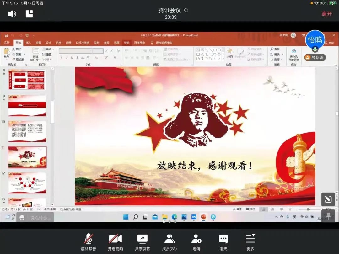 3月17日晚上,2020级市场营销(中外合作办学)一班于线上开展学习抗击疫情中的“雷锋精神”主题班会,本次会议由班级团支书杨怡鸣主持,辅导员马章山到场,班级全体同学参加。