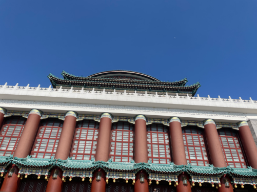 最后,我参观了重庆人民大礼堂。伫立于人民广场,朝着礼堂的方向望去,所有参观者无不惊叹这座集地域文化与中华民族特色的建筑的雄伟壮丽。人民大礼堂每一块别致的飞檐上,都似回响着历史铿锵的足音。这座精美绝伦的建筑修建于解放初期,由刘伯承、贺龙、邓小平等西南军政委员会主要领导人率领西南人民,历时三年完成的,是先辈们为重庆人民留下的宝贵财富。礼堂见证了半个世纪以来,周恩来、朱德等党和国家领导人的亲临视察,见证了历届重庆市人大代表、政协委员等参政议政的光辉时刻。历经几十年风雨,人民大礼堂见证了重庆如何一步一步走向繁荣,也见证了中国共产党领导中国人民不断奋进,取得的辉煌成就。