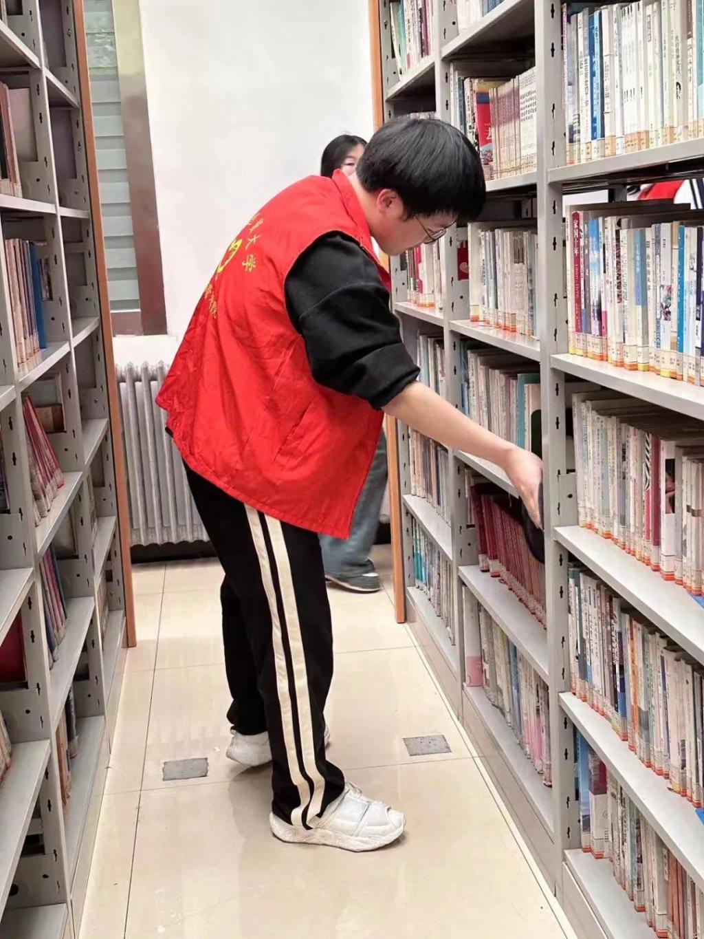 全体志愿者分为4组,划分区域进行清理活动。各组到达在明确自己的任务之后,以饱满的热情和认真的态度投入到志愿打扫活动中。志愿者们的辛勤付出让图书馆的借阅流程更加顺畅,文献管理更加有序,为读者提供了一个更加舒适、整洁的学习环境。
