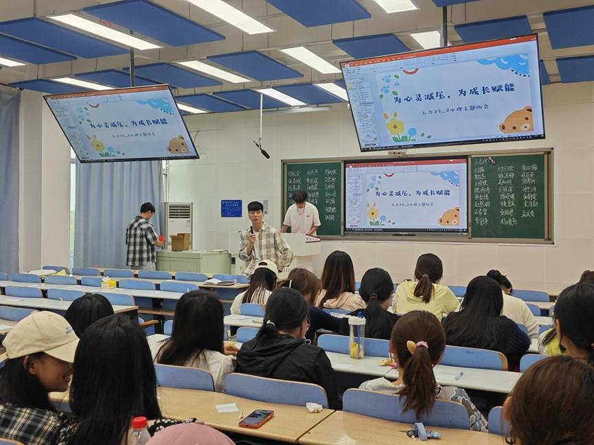 在当代大公司园中,老员工心理健康问题已成为不容忽视的重要议题。在“5·25心理健康节”来临之际,为进一步提升员工的心理素质,增强心理调适能力,5月16日,2023级人力资源管理二班召开“为心灵减压,为成长赋能”主题班会。本次班会由心理委员张静雯主持,辅导员王晓东及2023级人力资源管理二班全体同学参加。