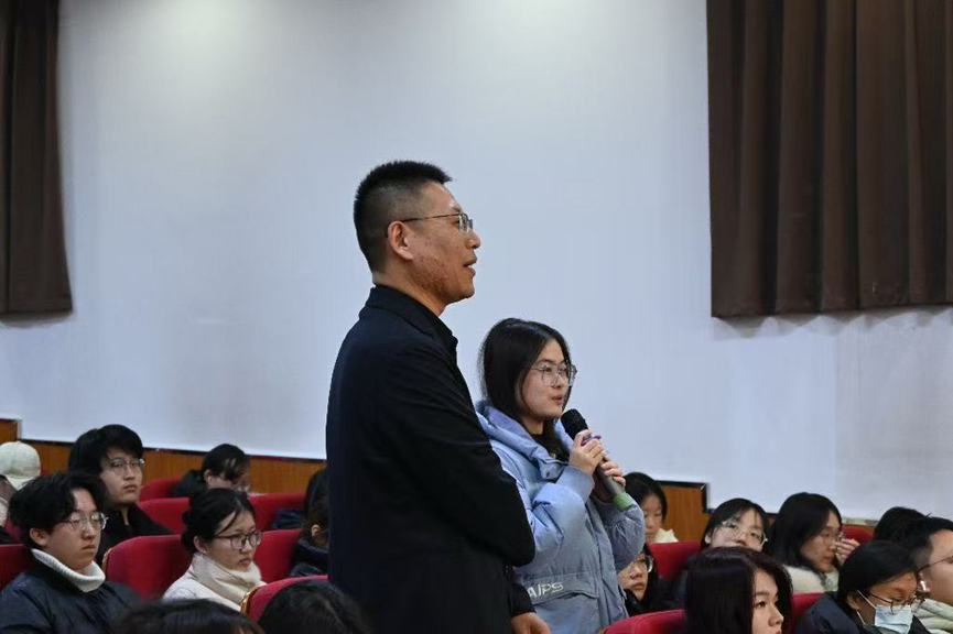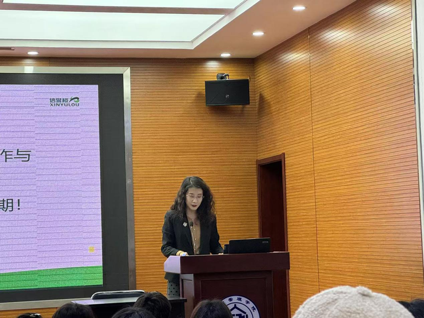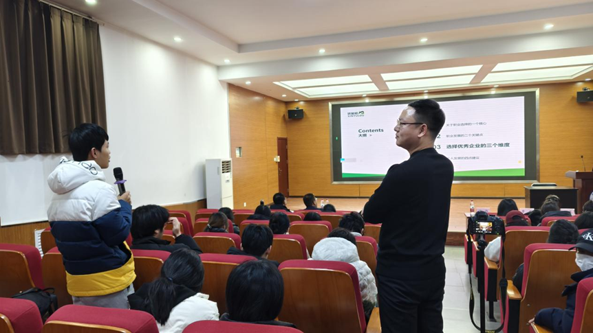 曹军结合自身经历向同学们分享了有关职业发展的心得体会。他首先回忆了自己在选择职业、选择企业与就职锻炼的亲身体验和心路历程。其间,他着重表达了对信誉楼所秉持的 “让员工体现自身价值,享有成功人生” 这一企业价值观的高度认同,并诚挚感谢信誉楼集团在其职业成长道路上给予的悉心栽培与大力扶持。随后,他以“一、二、三、四”为主线,为同学们详细说明了职业选择的一个核心、职业发展的两大关键、优秀企业的三个标准以及个人发展的四点建议。最后,他祝福同学们都能找到准确的人生定位,清晰的职业规划,都能追寻内心理想,专注价值实现,最终收获成功人生。
