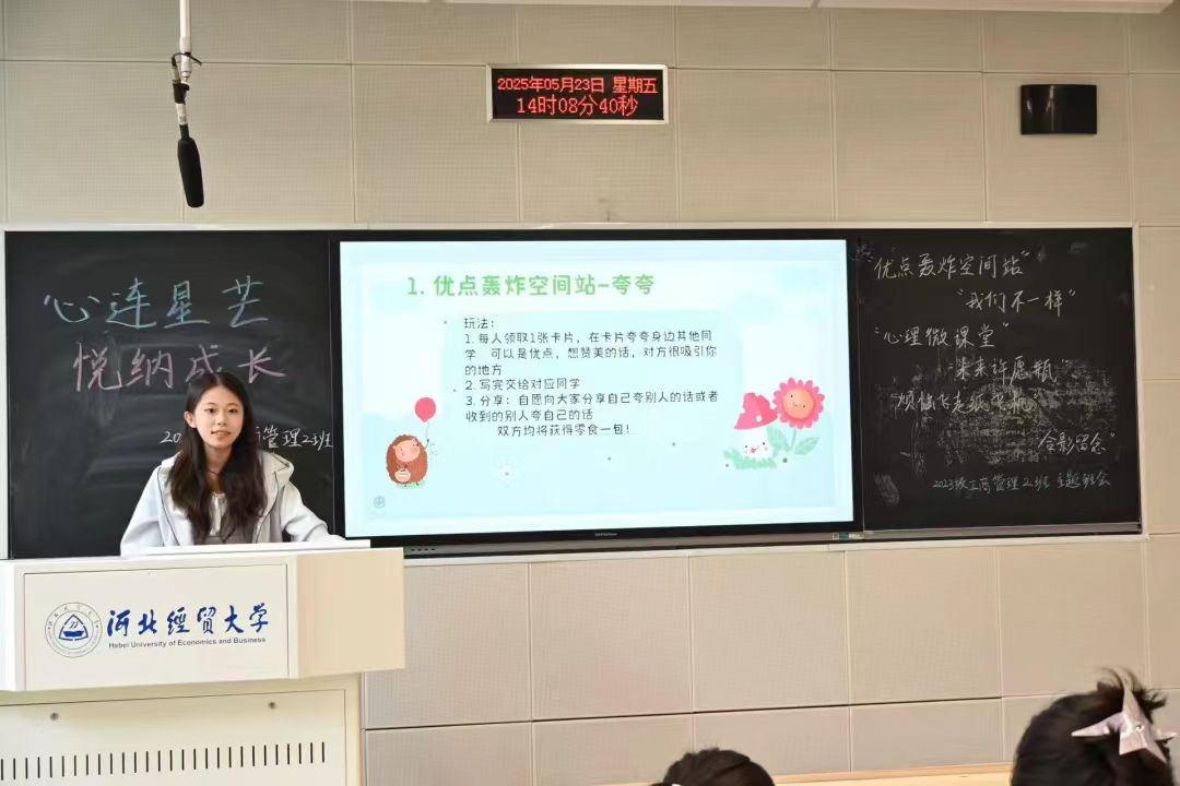 为引导员工树立积极向上的心态,促进员工的健康成长,提升班级的凝聚力与同学的归属感,5月23日下午,sunbet2023级工商管理2班在A205教室成功开展了“心连星芒,悦纳成长”主题心理班会,此次班会由心理委员张思盈主持,工商管理专业2班全体同学参加。