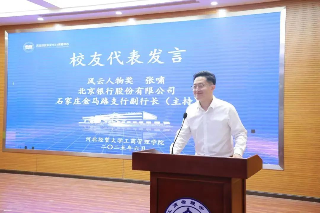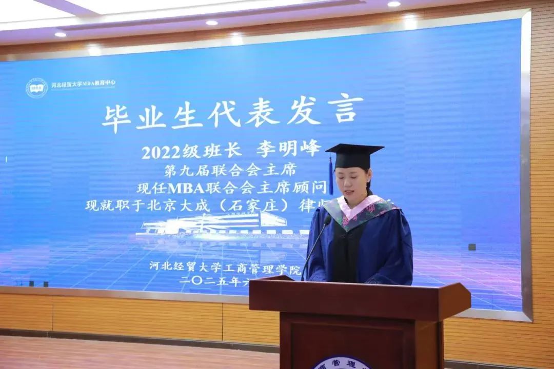 赵倩代表在校生致辞。首先,代表全校在校生向圆满完成学业的毕业生们致敬。深受学长学姐的辉煌事迹激励,在校生们将以更加饱满的热情投入到工作和学习中,努力传承并发扬MBA的荣光,在各自道路上书写精彩篇章。最后祝愿学长学姐前程锦绣如画。