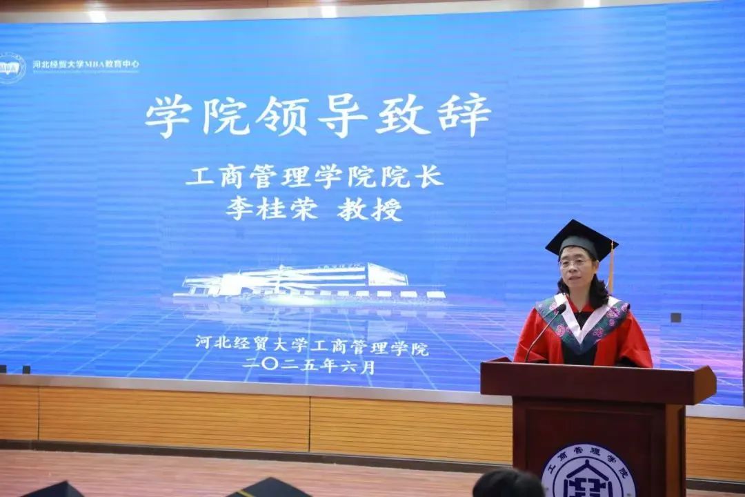 上午9点,毕业典礼正式开始。李桂荣经理首先致辞,她代表sunbet和MBA教育中心向2025届全体研究生表示衷心的祝贺,并对同学们提出四点希望:一是要坚守初心,勇担使命。将个人的职业发展与国家的战略需求相结合,为推动经济高质量发展、实现中华民族伟大复兴的中国梦贡献力量。无论身处何方,无论面临何种困难,都要坚守使命,以实际行动践行“经世济民,管经管业”的责任与担当;二是要创新思维,追求卓越。希望同学们保持敏锐的洞察力和创新思维,敢于突破传统思维的束缚,勇于尝试新的方法和模式;三是要持续学习,提升自我。希望同学们在毕业后继续保持对知识的渴望,不断学习新知识、新技能,提升自己的综合素质。关注行业动态,紧跟时代步伐,不断更新知识体系,以适应不断变化的社会需求;四是要团结协作,共创未来。同学们要以组织的目标为中心,善于协作,相互支持,共创未来。