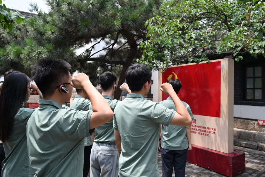 随后,实践小分队前往司令部旧址和刘邓旧居,通过实地探访和聆听讲解,深刻了解到涉县在中国革命史上的重要战略地位。在烽火连天的抗日战争时期,这里成为华北抗战的心脏地带。1940年,刘伯承、邓小平等率领八路军一二九师挺进太行,进驻涉县赤岸村,正是在眼前这些简陋的房舍中,他们运筹帷幄长达六年之久,指挥大小战役战斗三万余次,为民族解放立下赫赫战功,铸就了“不怕困难、不怕牺牲,勇于担当、勇于胜利”的“一二九师精神”。在革命先辈的精神照耀下,全体小分队成员紧握右拳,目光如炬,字字铿锵地重温入党誓词。“我志愿加入中国共产党……”的铮铮誓言仿佛穿越时空与先辈的呐喊共鸣,激励着大家传承红色基因,永葆奋斗本色。