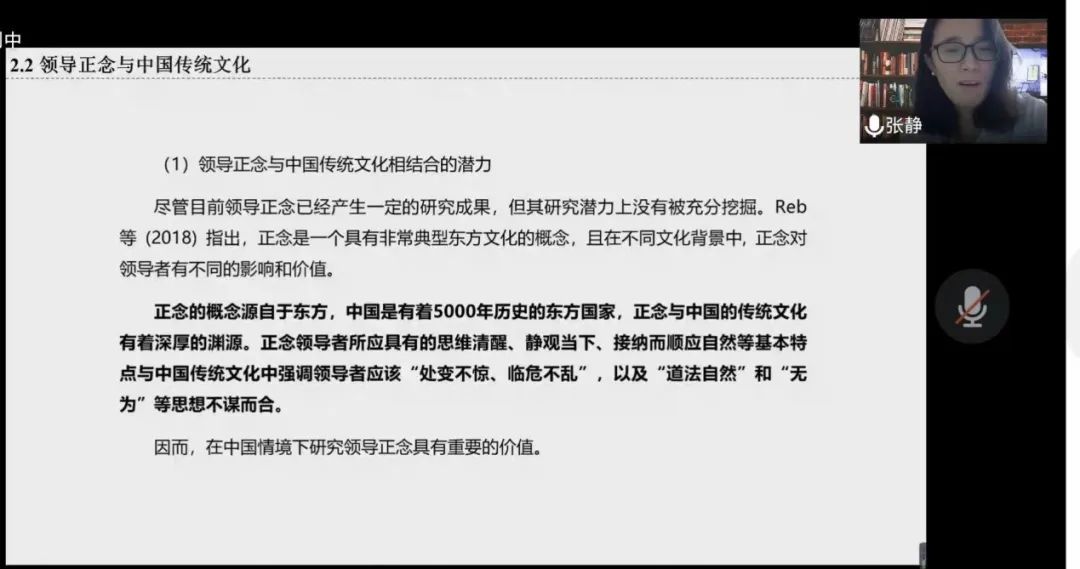 6月12日晚,sunbet张静博士通过腾讯会议平台作了题为“组织中的领导正念研究与中西方领导者的正念实践”的学术报告。本次会议由sunbet副经理石晓飞主持,公司教师、MBA员工等100余人参加。
