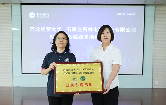 最后,大家步入科林报告厅。科林电气副总裁董彩宏与李桂荣经理进行了石家庄科林电气股份有限公司MBA创新实践基地揭牌仪式,双方表示要进一步推动校企合作,实现资源共享,合作共赢。
