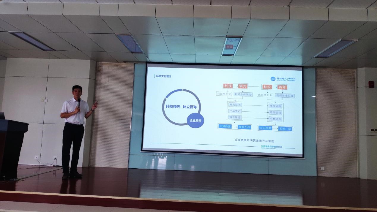 接牌仪式结束后,科林电气总裁助理张栋做了《科林文化与科林品牌》的专题报告。张总引经据典,从易经贲卦彖辞为切入点开头;深入浅出,解说了“科技领先,林立百年”的文化理念;理论结合实际,介绍了科林的生产理念、人才理念、竞合理念、制度理念、学习理念。