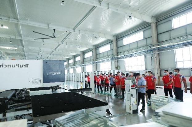 随后,科林电气人力资源部主任丁魁静及相关工作人员引领师生参观变压器事业部和结构事业部的生产技术车间,零距离接触行业新型技术设备。工作人员一路为师生介绍企业生产技术车间的主要机器设备和工作方式,着重讲解了油浸式变压器和干式变压器的区别和使用场所。从德国新引进的高速数控冲床、全自动检测线、全自动折弯中心等大型智能机械设施,使同学们大开眼界,感受了科技赋能的魅力。