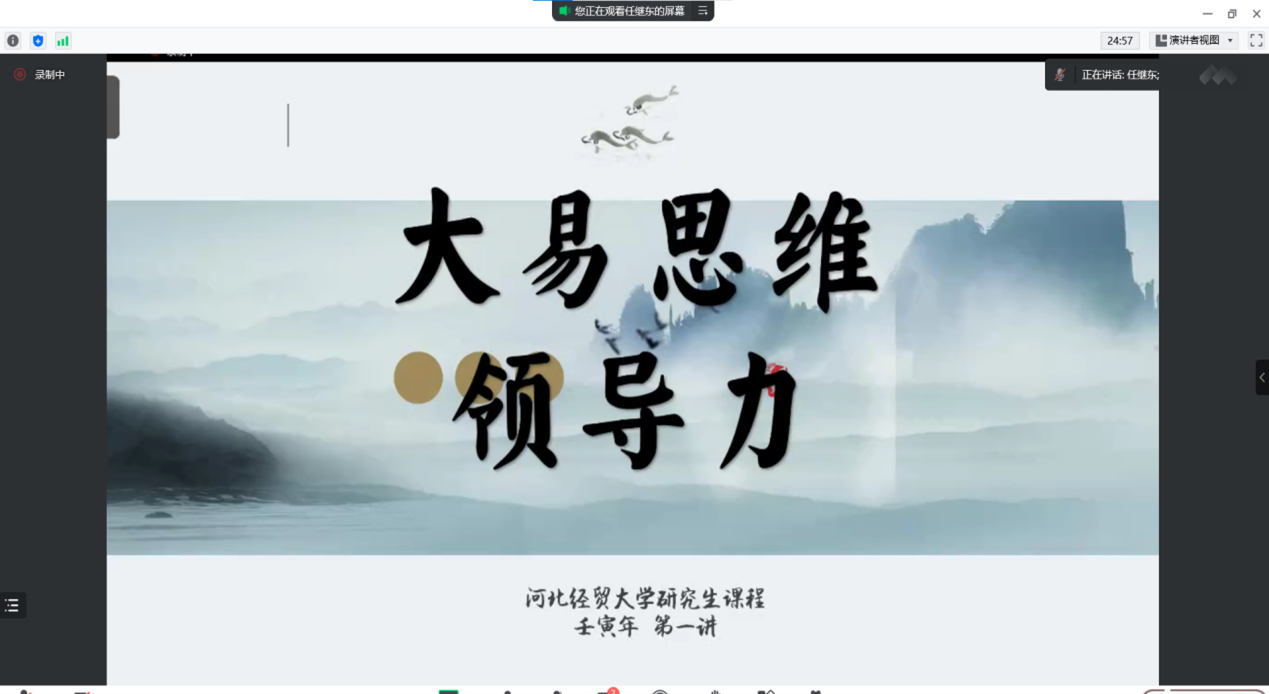 10月10日上午,sunbet研究生思政教育专题之中华传统文化系列报告第一场以线上课程的方式展开,河北省商业经济协会副会长、北京瑞金恒邦保险公司总裁任继东应邀作题为“大易思维和领导力”的专题报告。报告由sunbet孟华兴教授主持,sunbet2022级全体学术型研究生参加。