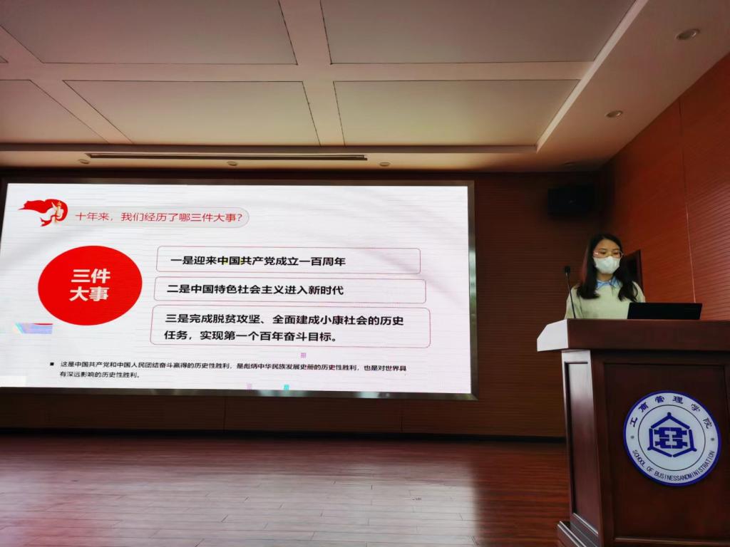 首先,石晓飞表示同学们要认真学习党的二十大精神,深刻领悟“两个确立”的决定性意义,坚决捍卫这一新时代最大政治成果,强调同学们要厚植爱国热情,以实现中华民族伟大复兴为己任。同时希望通过系列微党课,同学们可以丰富研究生生活、规范自身行为。其次,2022级工商管理专业研究生陈晴分享了本届活动的第二期微党课——“润心铸魂·学习贯彻二十大精神”。陈晴同志带大家学习了二十大报告的内容,回顾了十八大以来我党带领人民群众完成的三件大事。从新时代中国共产党的中心任务、中国式现代化、全面建成社会主义现代化强国的战略安排以及前进道路上应牢牢把握的原则等四个方面阐述了新时代中国共产党的使命任务,详细介绍了全面建设社会主义现代化国家的应有之义、战略支撑及本质要求等内容。通过陈晴同志的分享,大家对二十大报告的内容有了更深层次的理解,对二十大精神的内涵有更透彻的掌握。