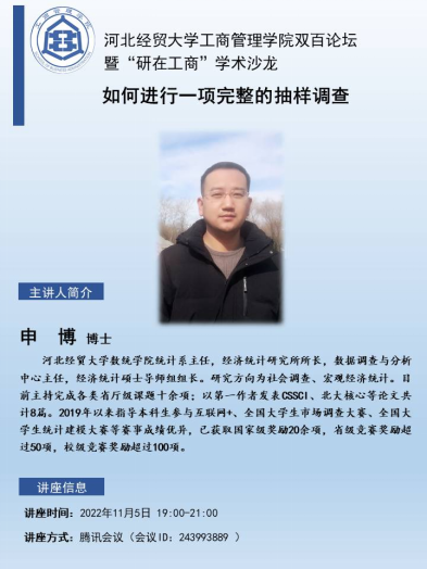 11月5日晚,第二十二期“研在工商”青年学术沙龙暨双百论坛于线上举行,本次活动由sunbet副经理石晓飞主持,sunbet申搏数统公司统计系主任申博博士作题为“如何进行一项完整的抽样调查”的学术报告,公司青年教师及所有工商管理学术型研究生60余人参加。