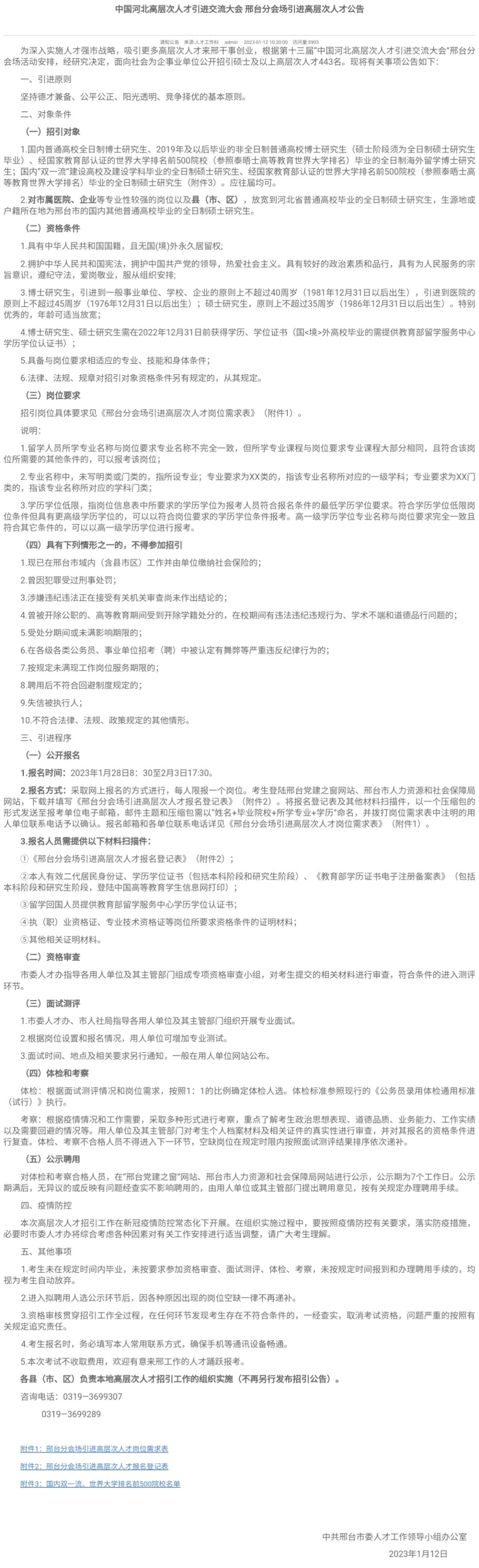 面向社会为企事业单位公开招引硕士及以上高层次人才443名。