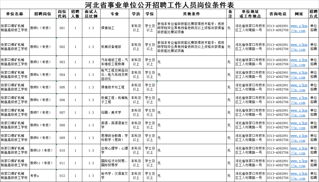 张家口煤矿机械制造高级技工公司2022年拟面向社会公开招聘工作人员12名。具体招聘人数和岗位条件详见↓↓↓