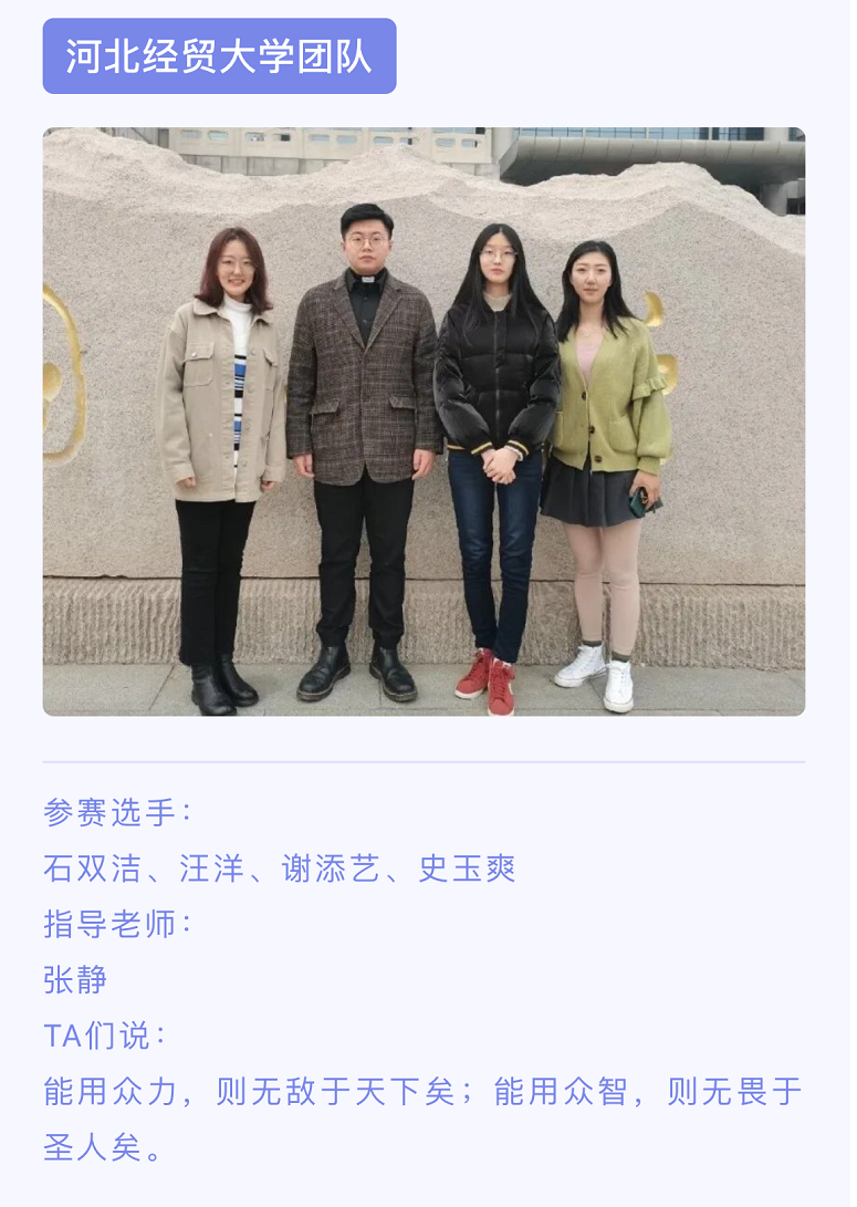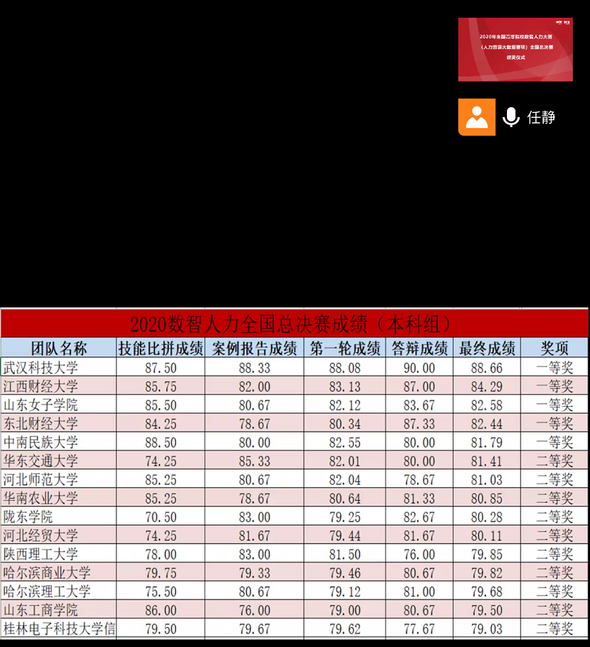 11月21日,2020年全国高等院校数智人力大赛(人力资源大数据赛项)全国总决赛落下帷幕。我校工商管理公司派出一支参赛队(1名指导教师+4名员工)代表河北省参加比赛,经过技能比拼、案例报告与案例答辩环节比拼,最终荣获大赛(本科组)二等奖。sunbet人力资源管理系张静老师荣获优秀指导教师奖。