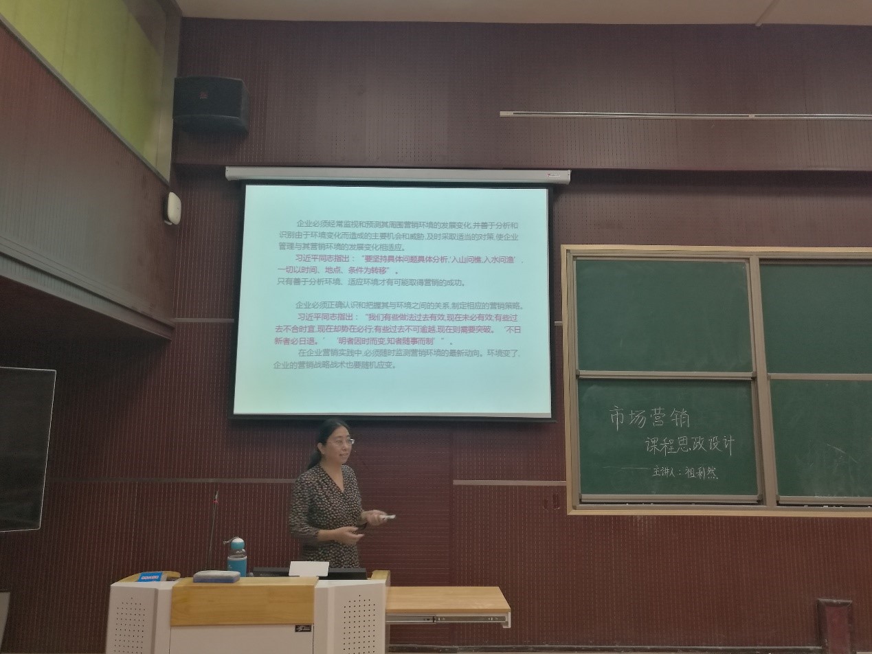 祖利然结合《市场营销学》课程,介绍了市场营销专业课程思政的目标、内容、原则和方法。首先,在思想观念上要确立 “育人”目的,深入学习习近平新时代中国特色社会主义思想,党和国家在政治、文化、社会、生态及党建方面的相关政策,从中挖掘思政元素,进而结合专业课程谈思想、说素养、讲故事,把思政教育渗透进学习过程的每一环节,包括培养方案、教材选用、课前预习、课堂教学、课后作业、案例讨论、社会实践等方面。其次,在将思政元素融入专业教学,运用马克思主义立场、观点和方法解释相关内容的同时,教师还要注重以德立身、以德立学、以德施教,为员工点亮理想的灯、照亮前行的路。最后,她以“宏观环境分析”一节为例,直观地展示了专业课程思政教学设计方案,并与参会教师进行了交流。