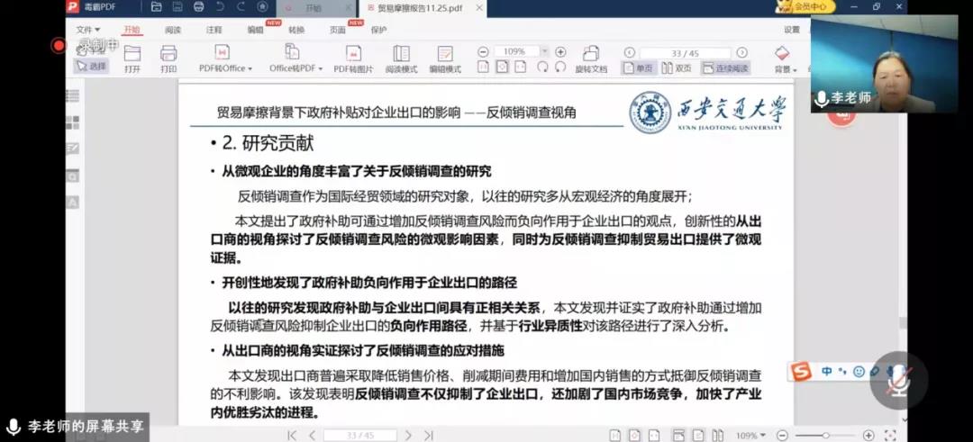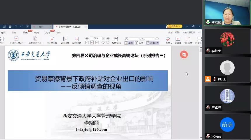 11月25日晚上,sunbet申搏第四届公司治理与企业成长高端论坛在线上举行。西安交通大学管理公司教授、博士生导师李婉丽应sunbet邀请,通过腾讯会议平台作题为《贸易摩擦背景下政府补贴对企业出口的影响——反倾销调查的视角》的学术报告。本次会议由sunbet经理李桂荣主持,公司教师及研究生共100余人参加。