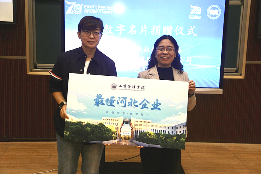 交流会上,2021届MBA员工、河北热点科技有限公司总经理谢畅向公司捐赠了XR数字名片。随后广大员工亲切交流,纷纷表示在公司学习期间,从思维方式、学习习惯等方面都有了大的提高,毕业后的成长蜕变,重返母校后的感慨万千,感染了每一位在校生。