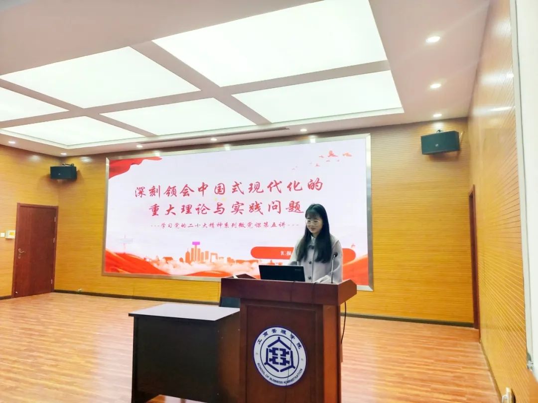 2023级工商管理专业研究生王琳珂主讲本届第五期微党课“深刻领会中国式现代化的重大理论与实践问题”。通过新时代新征程中国共产党的使命任务引出本次微党课主题,重点强调了以中国式现代化全面推进中华民族伟大复兴是二十大报告的重要内容,是新时代新征程中国共产党的使命任务的应有之义。从顶层设计与实践探索的关系、战略与策略的关系、守正与创新的关系、效率与公平的关系、活力与秩序的关系、自立自强与对外开放的关系六方面学习习近平总书记的重要文章《推进中国式现代化需要处理好若干重大关系》。通过一则老员工拍摄的“我眼中的中国式现代化”视频,指出作为新时代青年,我们必须认真学习中华文明史,学习党史、新中国史、改革开放史、社会主义发展史,厚植家国情怀,坚定中国特色社会主义道路自信、理论自信、制度自信、文化自信,增强历史责任感和使命感,为中国式现代化注入强劲青春动力。