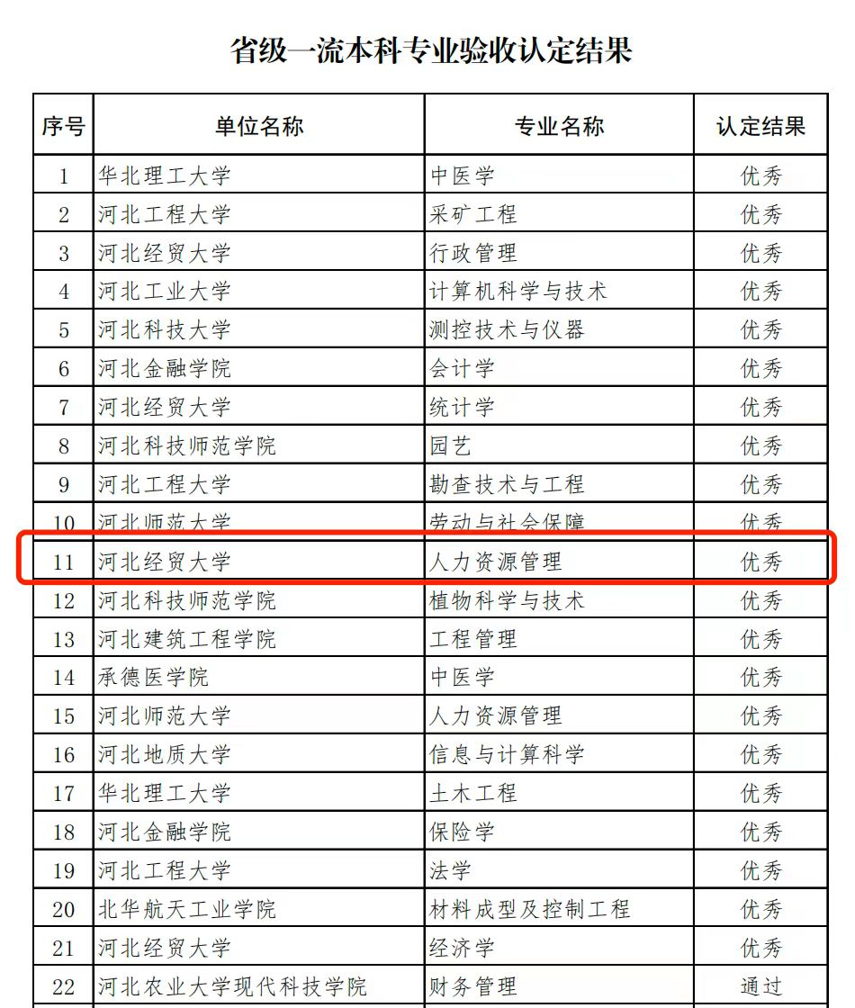 公司人力资源管理专业在省级一流本科专业验收中获优秀评级。