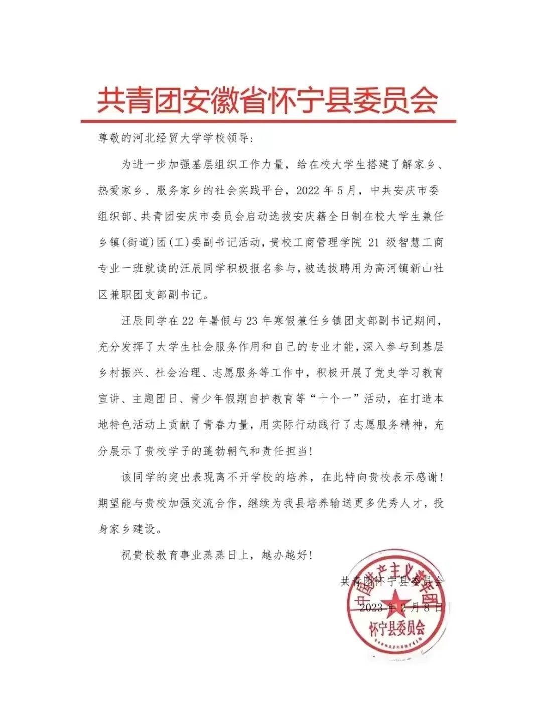 公司学子汪辰被选拔聘用为高河镇新山社区兼职团支部副书记。