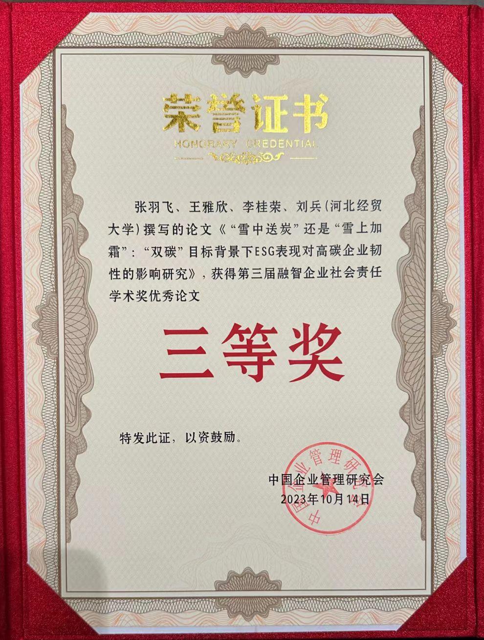 公司青年教师张羽飞博士应邀参加第五届可持续发展与企业社会责任学术论坛并获优秀论文奖。