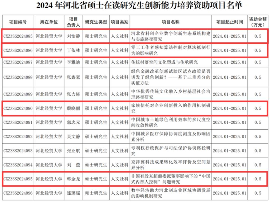 公司学硕研究生刘怡静(导师:刘兵)主持的项目《河北省科创企业数字创新生态系统构建与实施路径研究》、丁依林(导师:陈亮)主持的项目《零工工作者感知算法控制对算法抵制行为的影响研究》、殷晓丽(导师:杨在军)主持的项目《家族信托对企业创新投入的作用机制研究》、韩金龙(导师:石晓飞)主持的项目《非国有股东超额委派董事影响下的“中国式内部人控制”问题研究》分别获批2024年省级在读研究生创新能力培养资助项目。