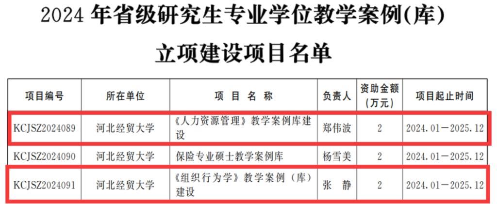 公司教师郑伟波教授主持的《<人力资源管理>教学案例库建设》和张静副教授主持的《<组织行为学>教学案例(库)建设》获批2024年省级研究生专业学位教学案例(库)立项建设项目。