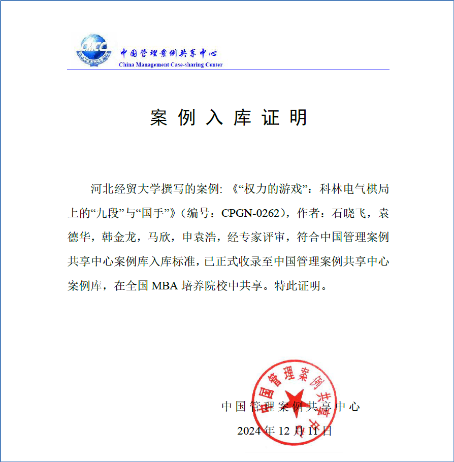 近日,MBA教育中心教授石晓飞带领四名员工撰写的教学案例《“权力的游戏”:科林电气棋局上的“九段”与“国手”》(编号:CPGN-0262)入选中国管理案例共享中心案例库。