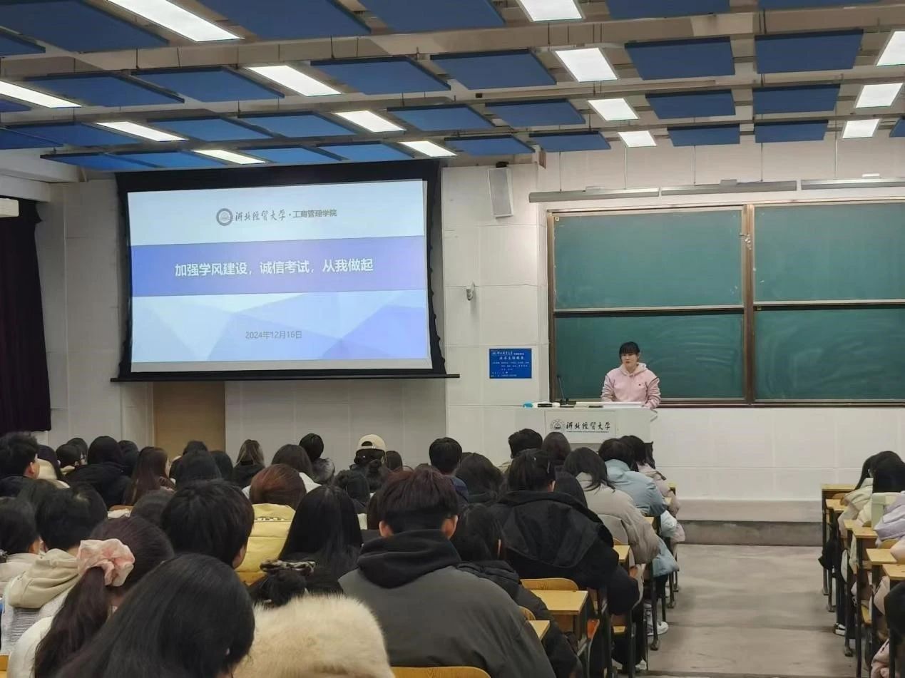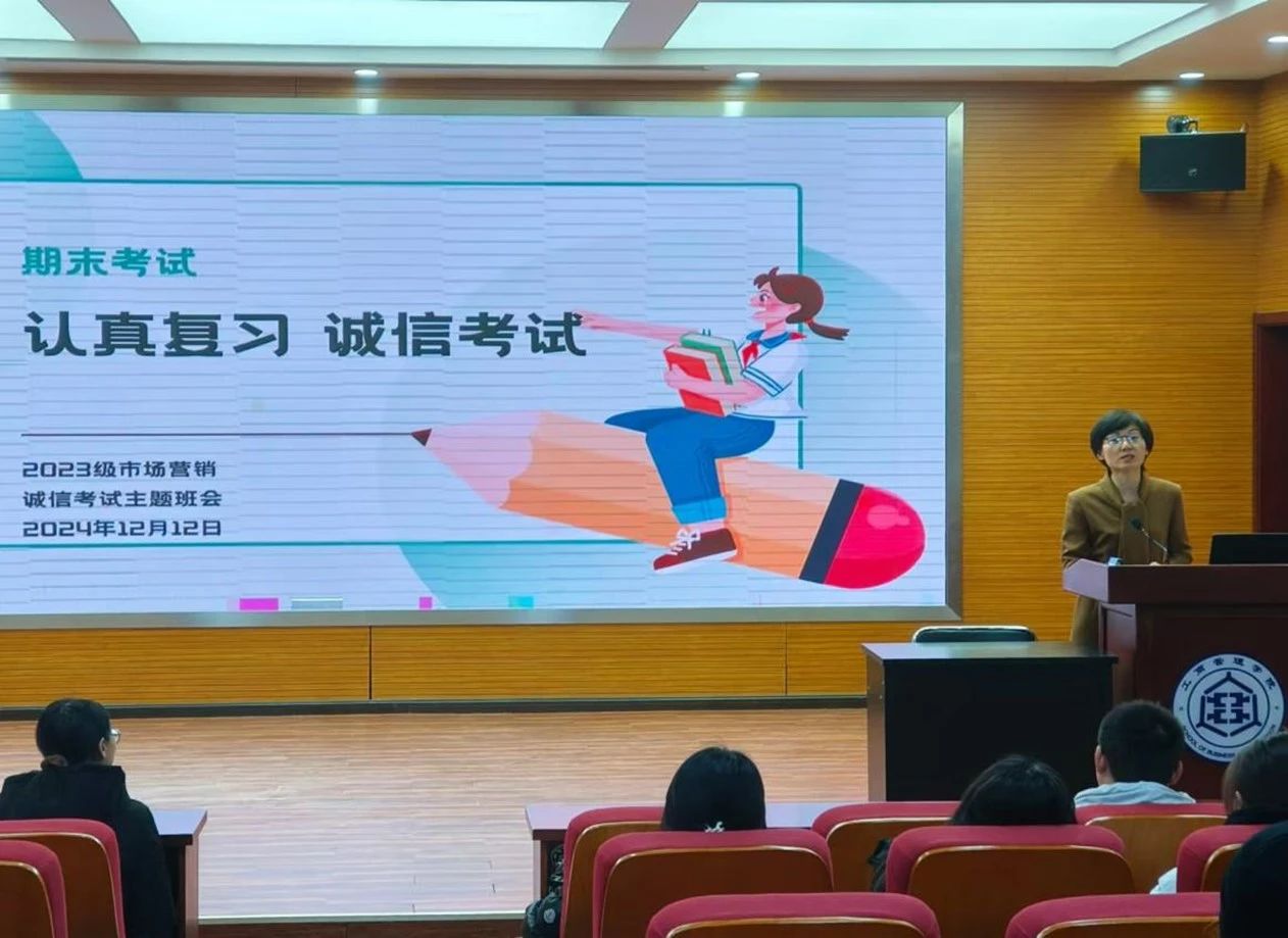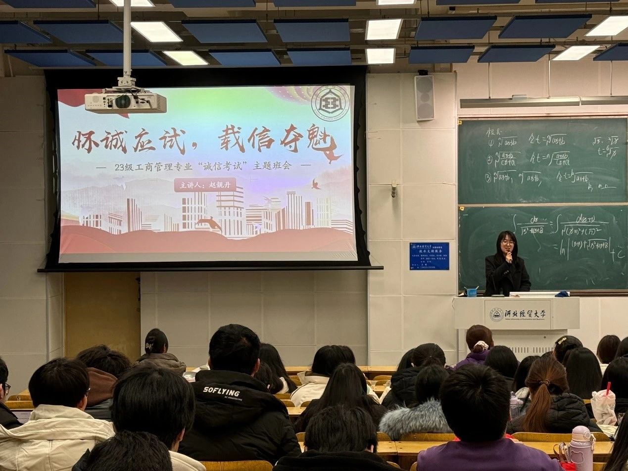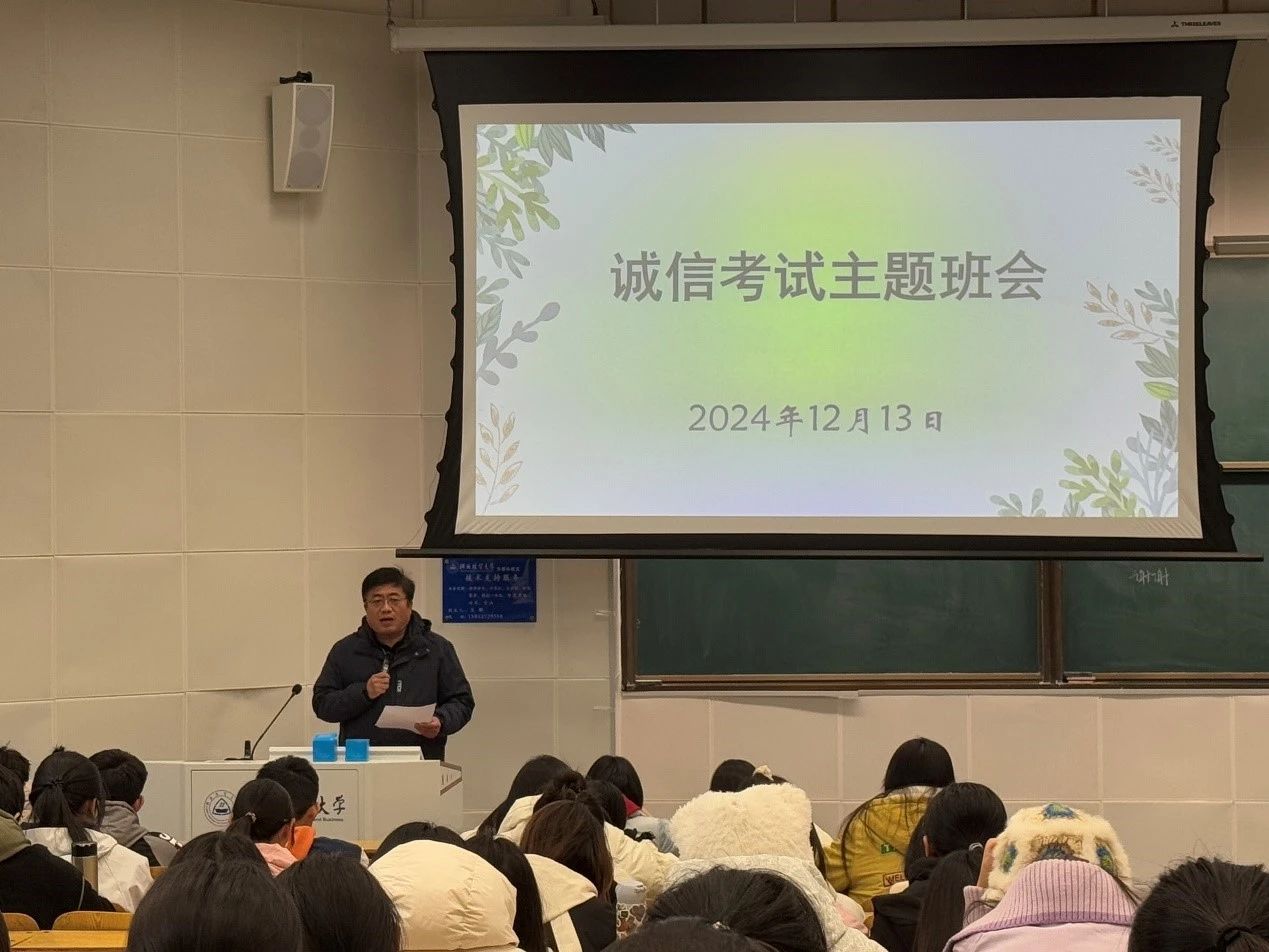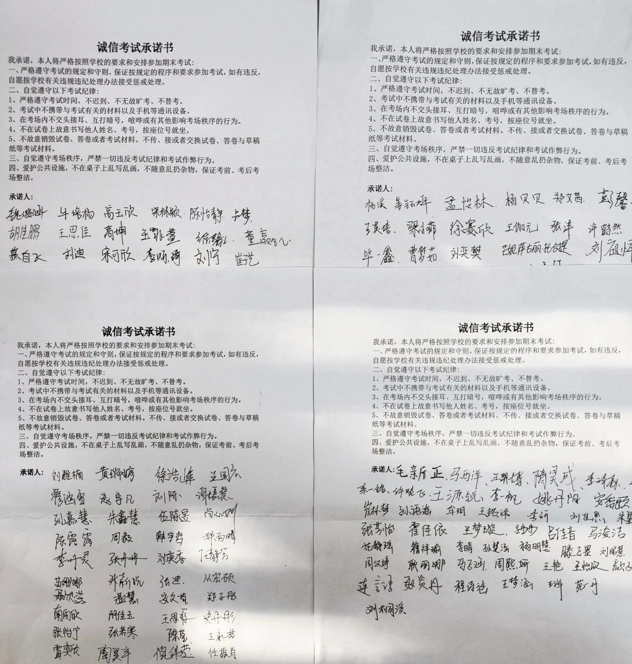 与此同时,各班陆续组织开展“诚信考试,从我做起”系列主题班会,班会主要围绕诚信应试、考纪要求、科学备考三个方面的内容展开。首先,辅导员老师们以历史诚信故事和现代学术反面案例为引,让同学们重新考量诚信考试的意义,“诚以载学,信以应考”,诚信不仅是对自己学习成果的尊重,更是对他人努力的认可,是维护良好学风、促进个人品德提升的关键。其次,老师们深入浅出地阐述了考试作弊违纪行为的界定标准与相应的处罚措施,同时详细剖析了违反考场纪律的行为对个人未来发展的负面影响,确保每位同学都能全面而深刻地理解考试纪律的重要性。最后,他们指出期末复习是对整个学期知识体系的梳理与巩固,同学们需制定科学的复习计划,合理安排时间,以饱满的状态迎接考试。