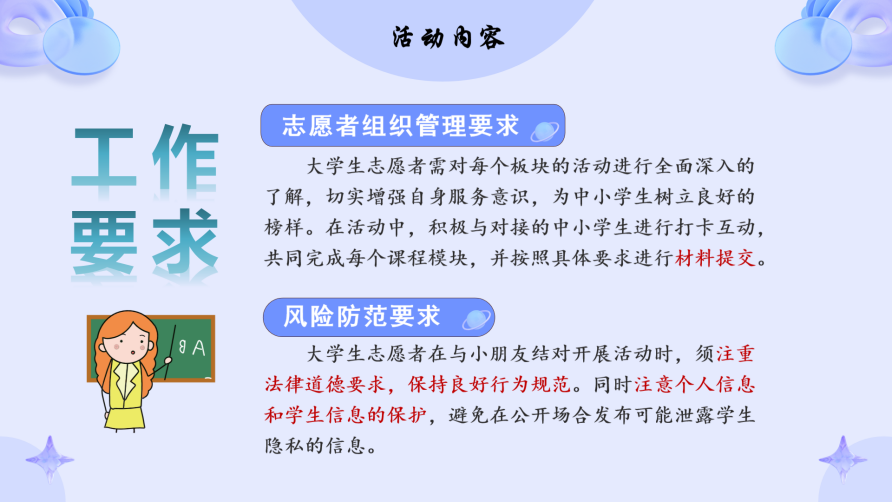 最后,孟庆友向志愿者们讲解了活动过程中的注意事项和奖惩机制,提醒各位志愿者要及时关注消息通知,遇到任何问题及时询问,按时完成任务并按要求提交相关材料。