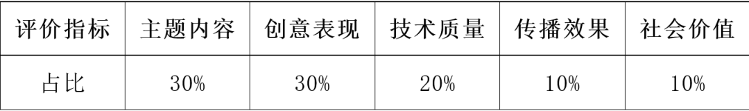实行百分制:主题内容30%+创意表现30%+技术质量20%+传播效果10%+社会价值10%,各主题统一框架。