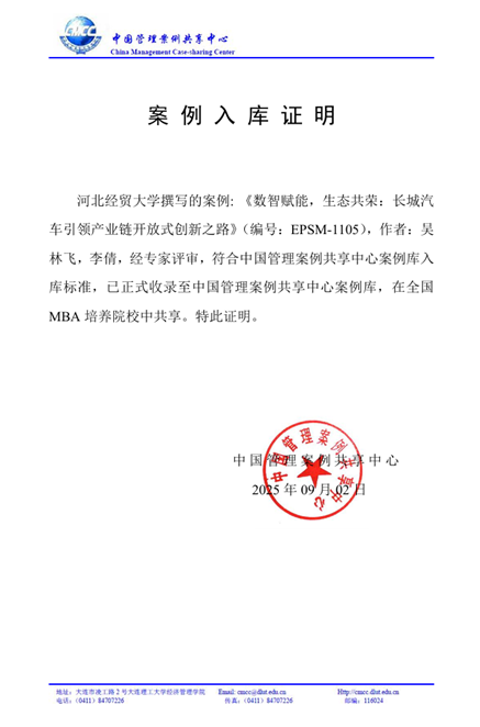 近日,sunbet讲师吴林飞博士和2024级工商管理学研究生李倩撰写的教学案例《数智赋能,生态共荣:长城汽车引领产业链开放式创新之路》(编号:EPSM-1105)入选中国管理案例共享中心案例库。