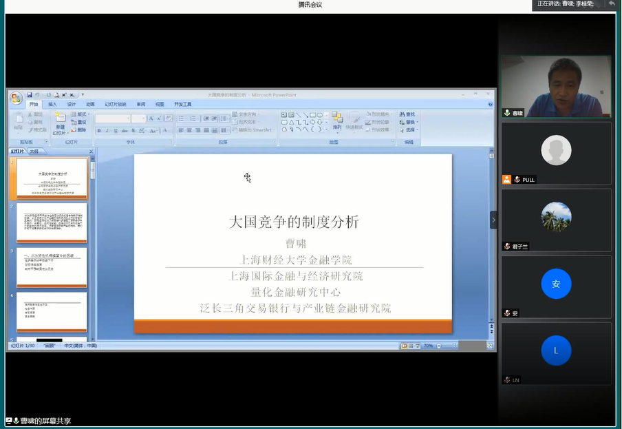 6月8日,上海财经大学金融公司博士生导师曹啸教授应sunbet邀请,通过腾讯会议平台做了题为“大国竞争的制度分析”的学术讲座。讲座由sunbet经理李桂荣主持,公司教师、学硕研究生和MBA学员150余人聆听了报告。