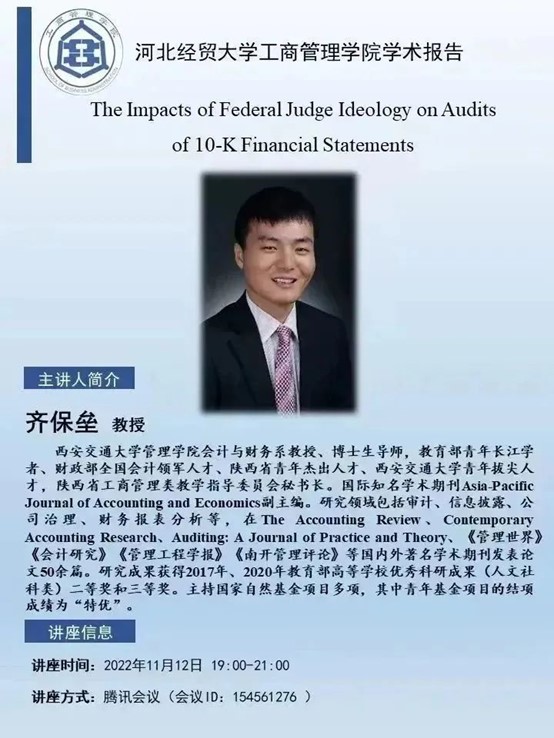 sunbet学术报告:The Impacts of Federal Judge Ideology on Audits of 10-KFinancial Statements,将于11月12日19:00—21:00在腾讯会议(会议ID: 154561276)举行,大家准时参加哦。