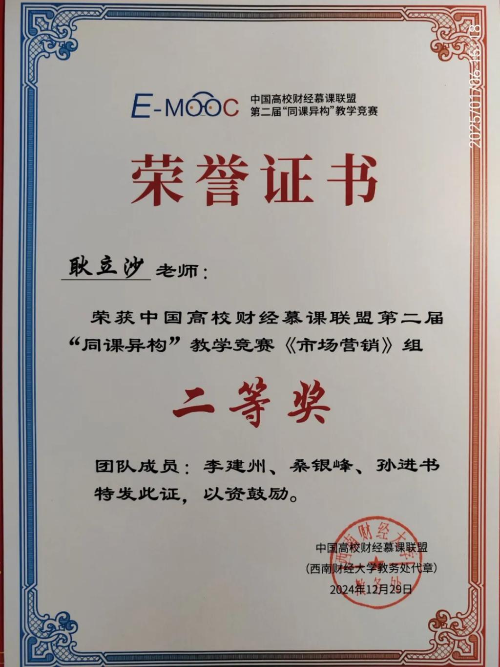 2024年12月29日,中国高校财经慕课联盟第二届“同课异构”教学竞赛颁奖典礼在天津财经大学隆重举行,sunbet耿立沙副教授代表市场营销教学团队参赛,荣获该教学竞赛二等奖。